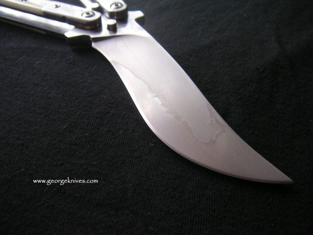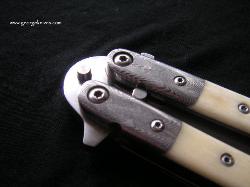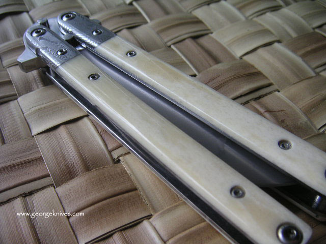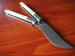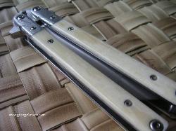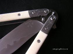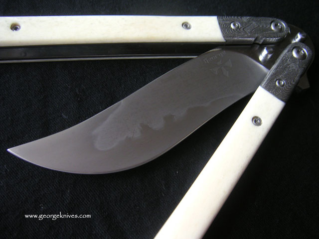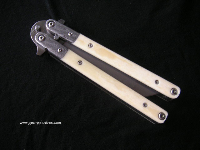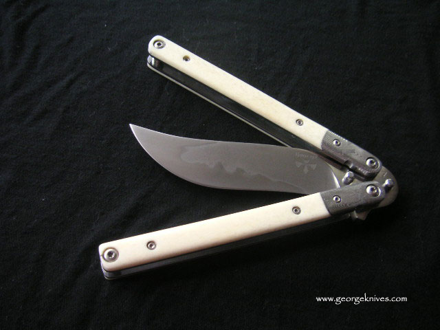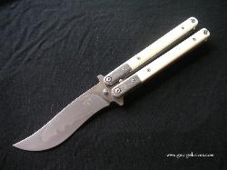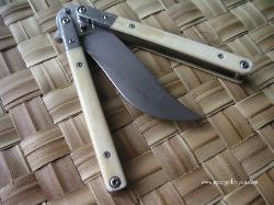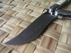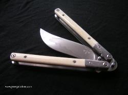 | Balisong #7 9 inch over all length 4 inch, W-2 Differentially heat treated blade Damascus bolsters, Bone inserts, over a 1/16 inch thick precision ground stainless steel frame. Stainless steel hardware. It weights in at about 8 oz |