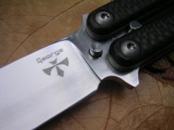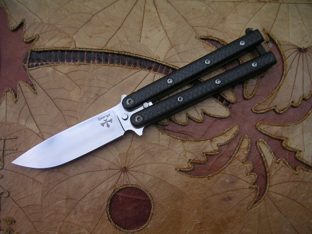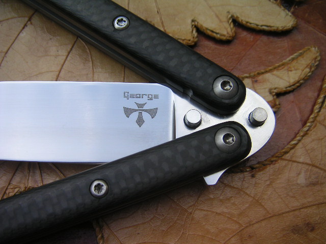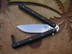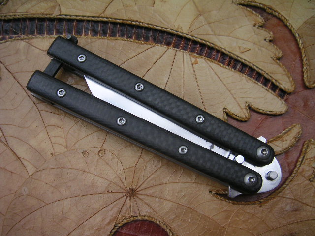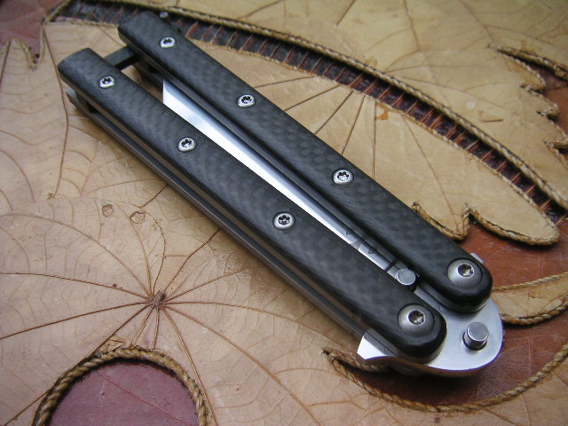 Carbon finer over skeletalized stainless steel handles, 1/4 stainless pivots, a hollow ground D-2 blade and as always