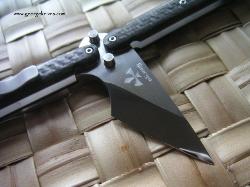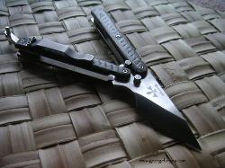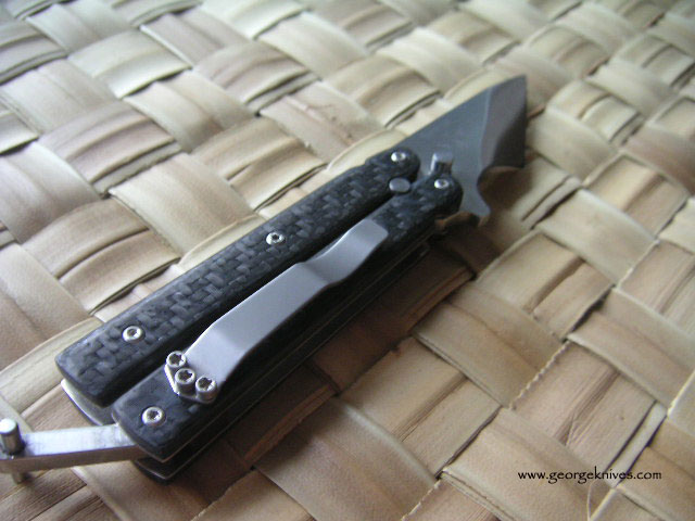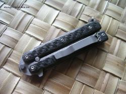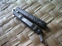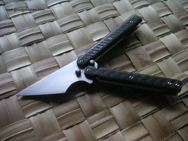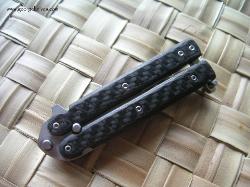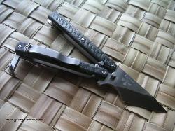 | Exacto-Bali 5/32 thick A-2 on the blade. It weights in at a mighty 3oz. The cutting edge is 1.8 inches long and the length from the tang pin to tip is 1.75 inches. Over all length is 6.25. Titanium liners and carbon fiber handles. All the hardware is stainless steel. The latch and clip where bead blasted. |
